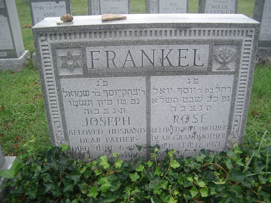 RACHEL bat R' YOSEF YOEL Died 22 Shevat 5731 TNZB"H (May her soul be bound in life) ROSE Beloved wife and mother Dear grandmother Died Feb. 17, 1971 Age 86 years |