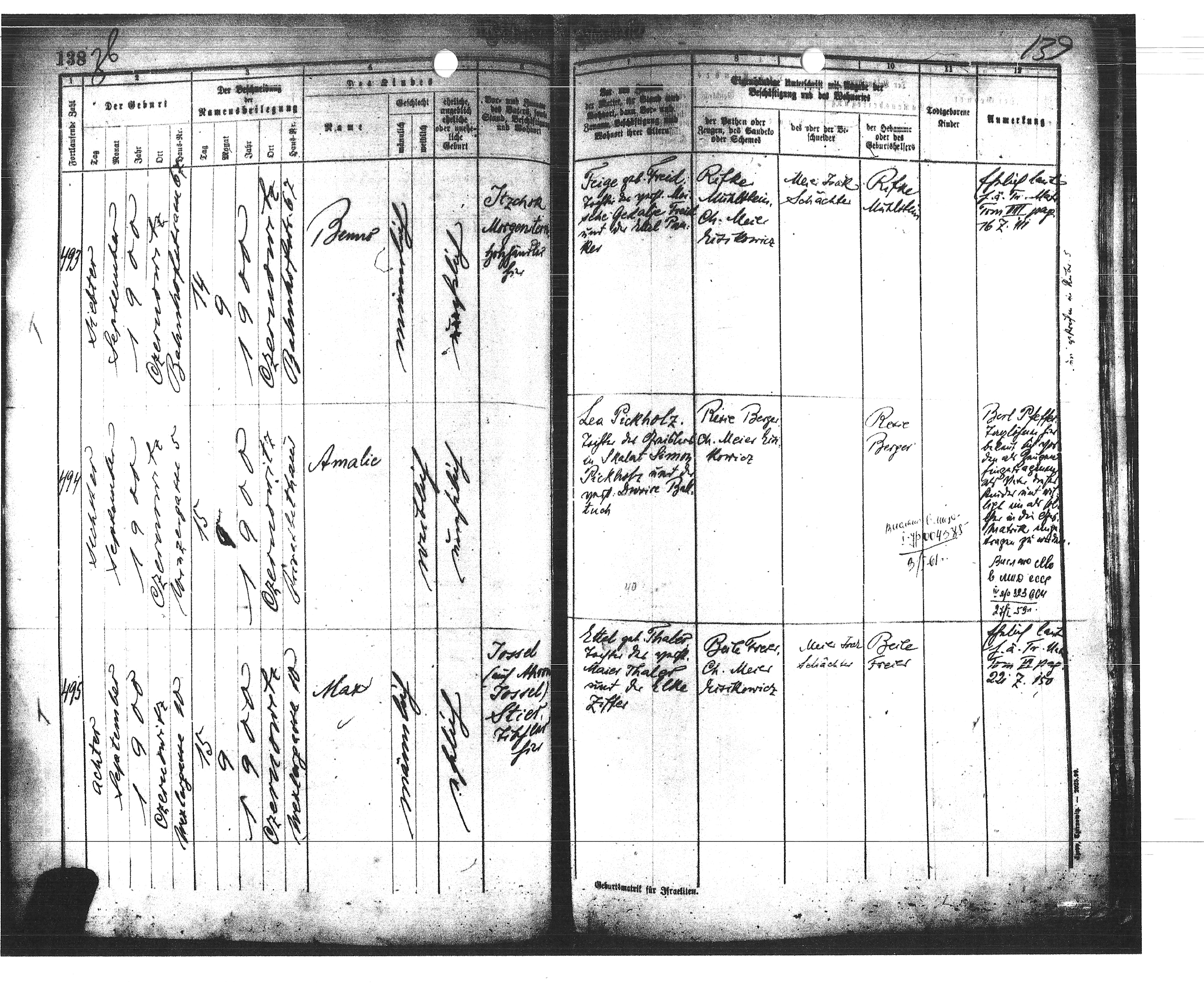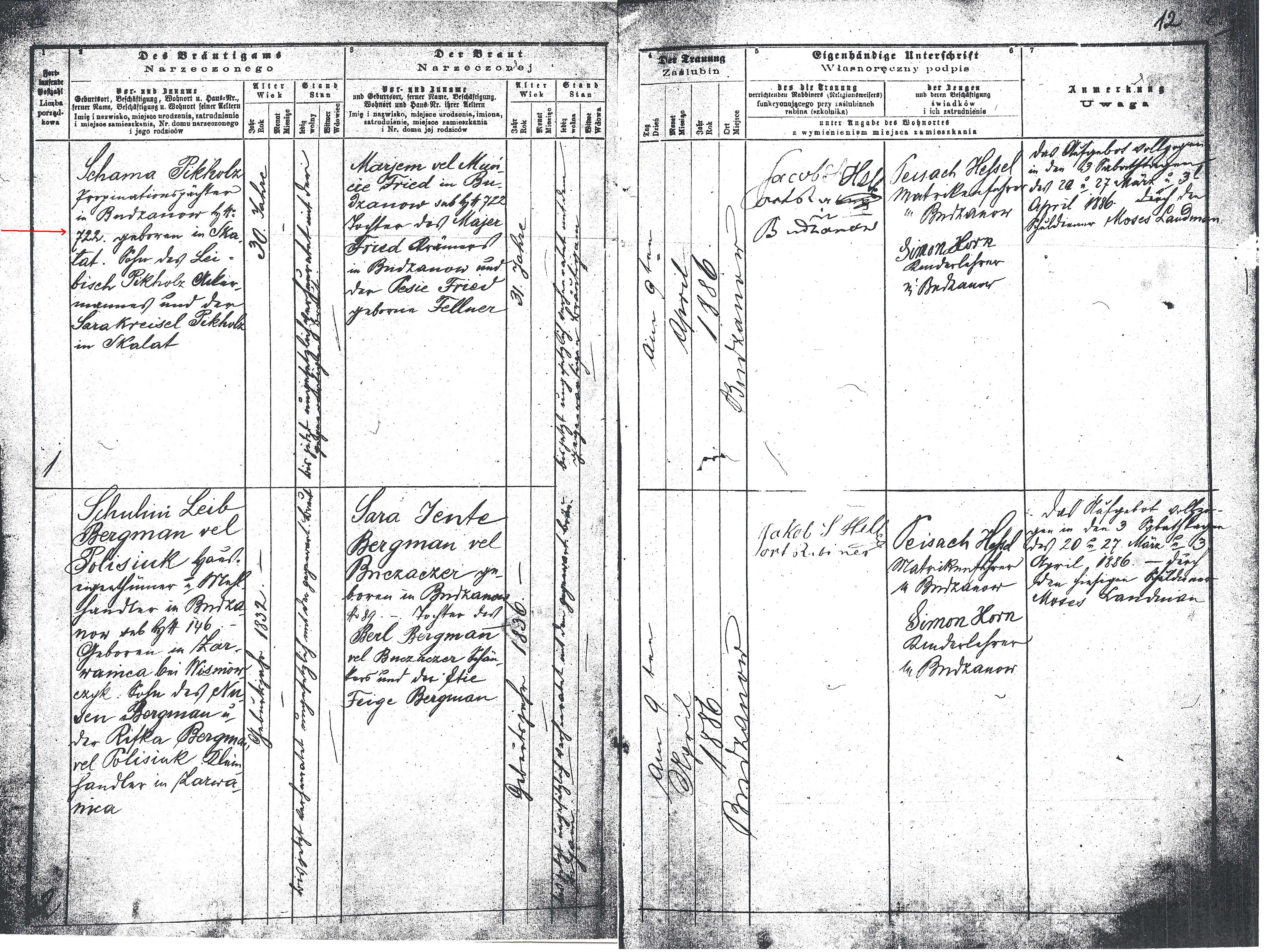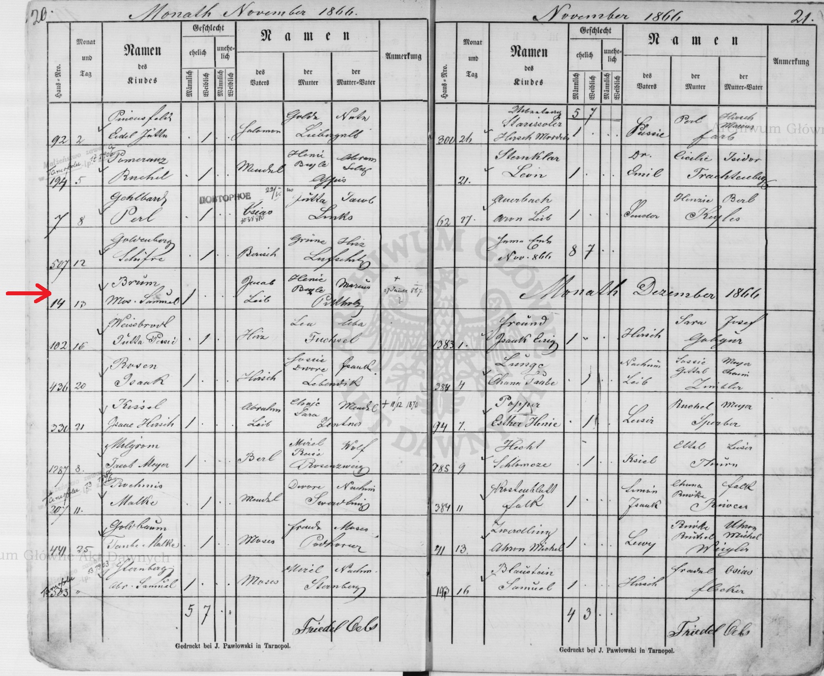 1 | 13 Nov 1866 | 14 | Moses Samuel Brum | Jacob Leib | Henie Bayle Pikholz | Markus | Died 27 Jan 1867? | May be Henie from Eliezer family | |||
