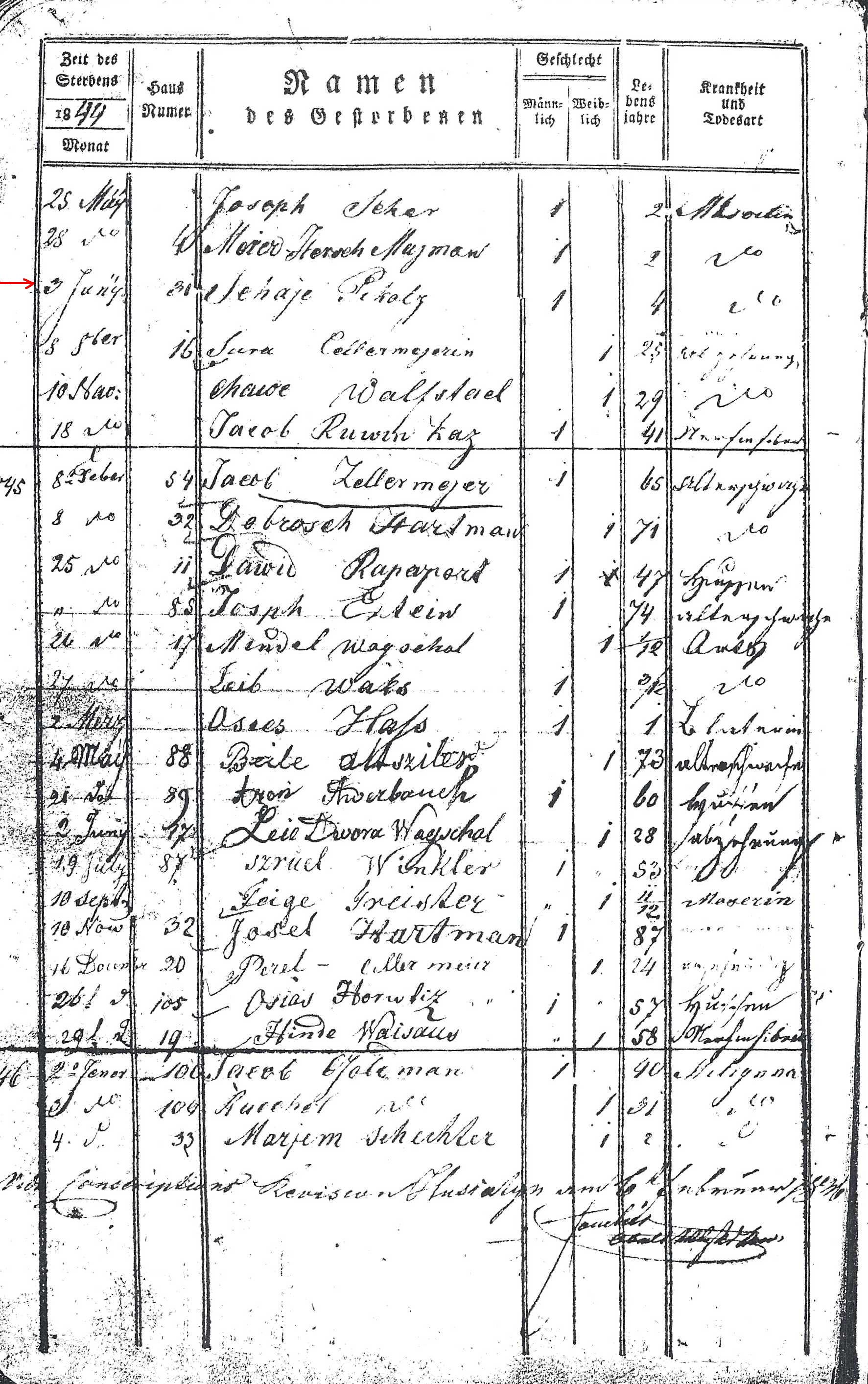 28 | 30 May 1867 | 66 | Lipsche Kornberg | Chaim | Sara Rivke Stein | Eisig | IF3 | Married to Rozdol Pikholz in Budapest. | |||
