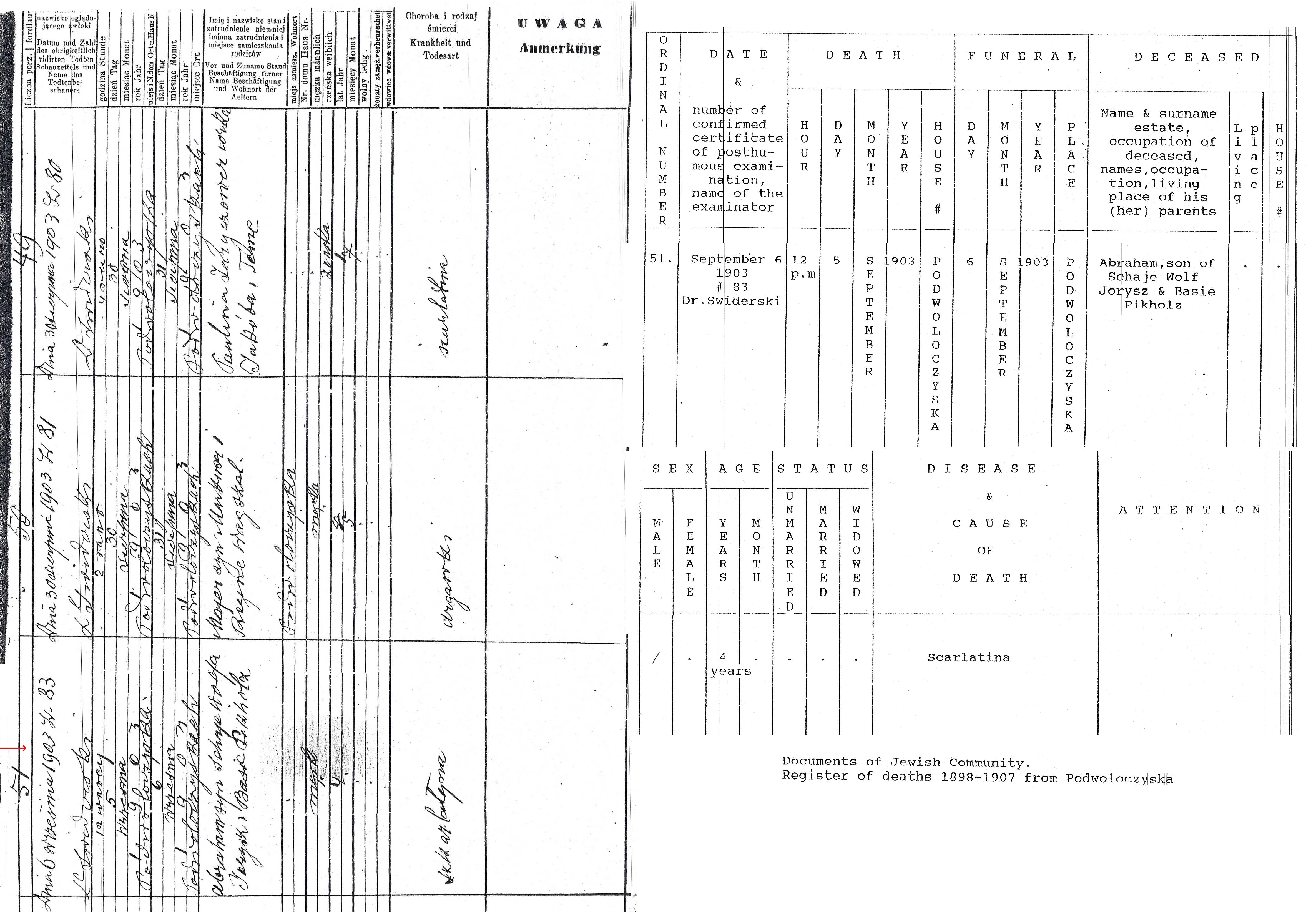 3 | 16 Jan 1904 | Julie | Berl Pfeffer | Lea Pikholz | Simon Pikholz & Dwore Waltuch | Skalat | DORA | ||||