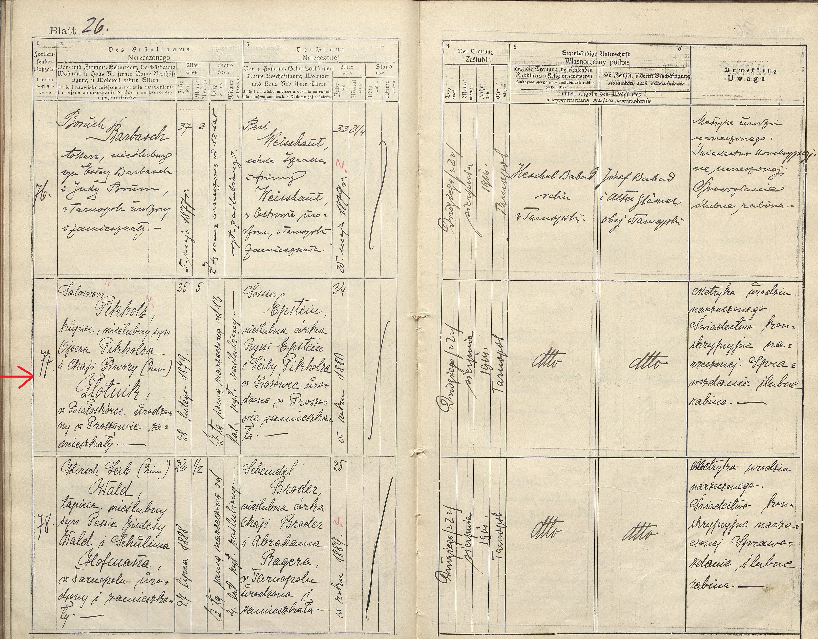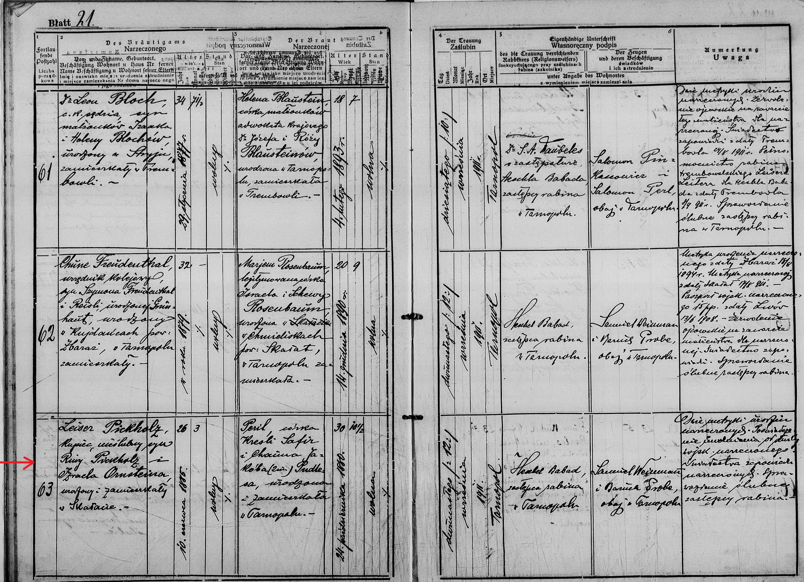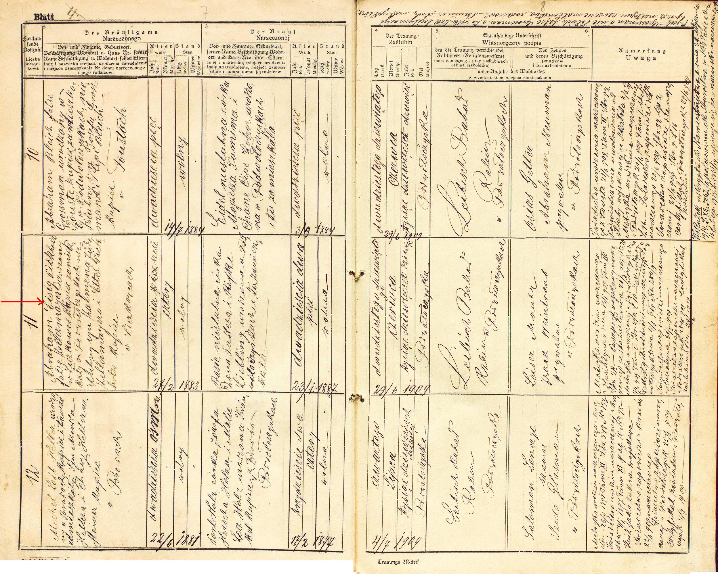16 Jul 1904 | Scheindel Pickholz | Schaje Wolf Jorysz | Basie | Josef and Fradel Pickholz | Tarnoruda | RITA? |