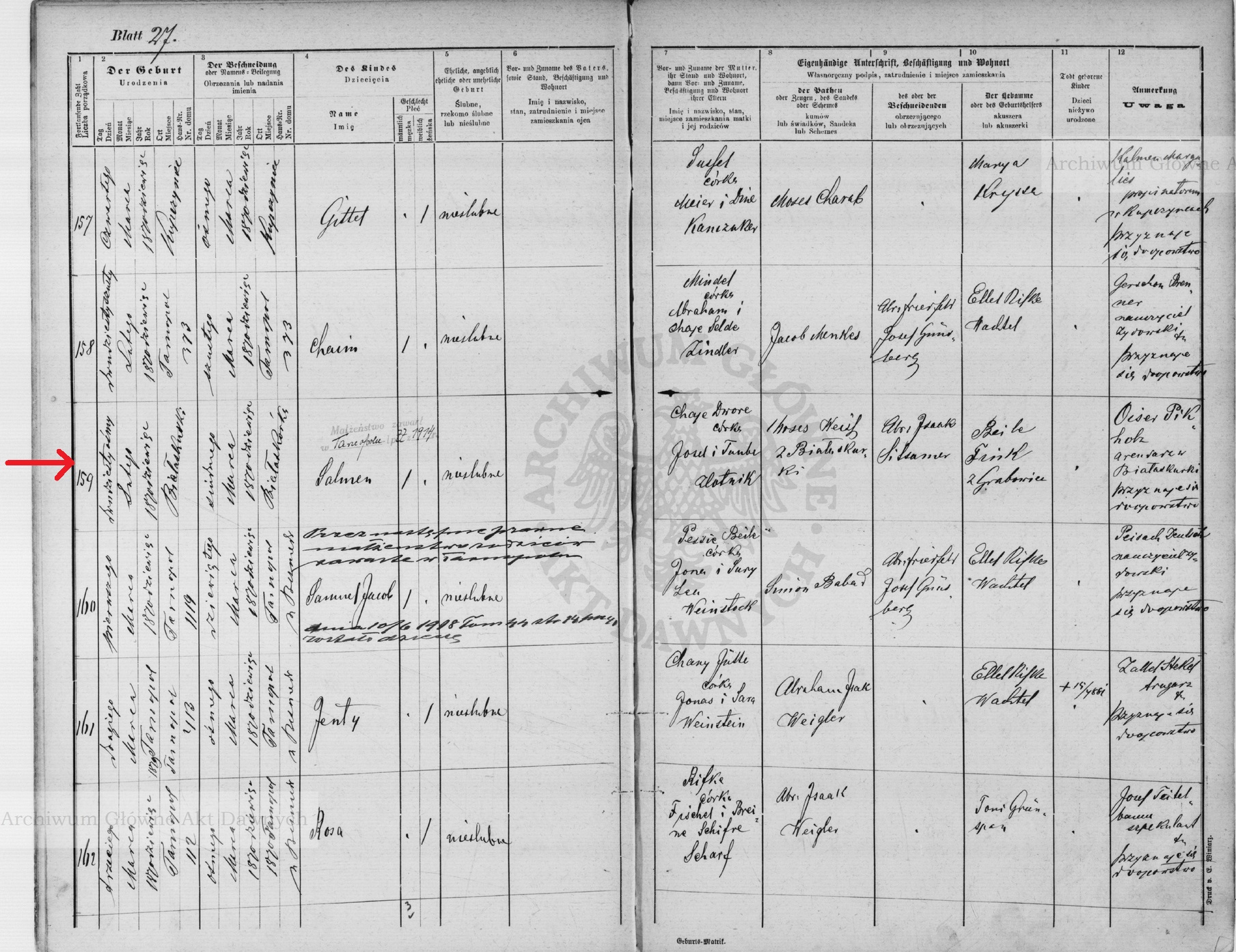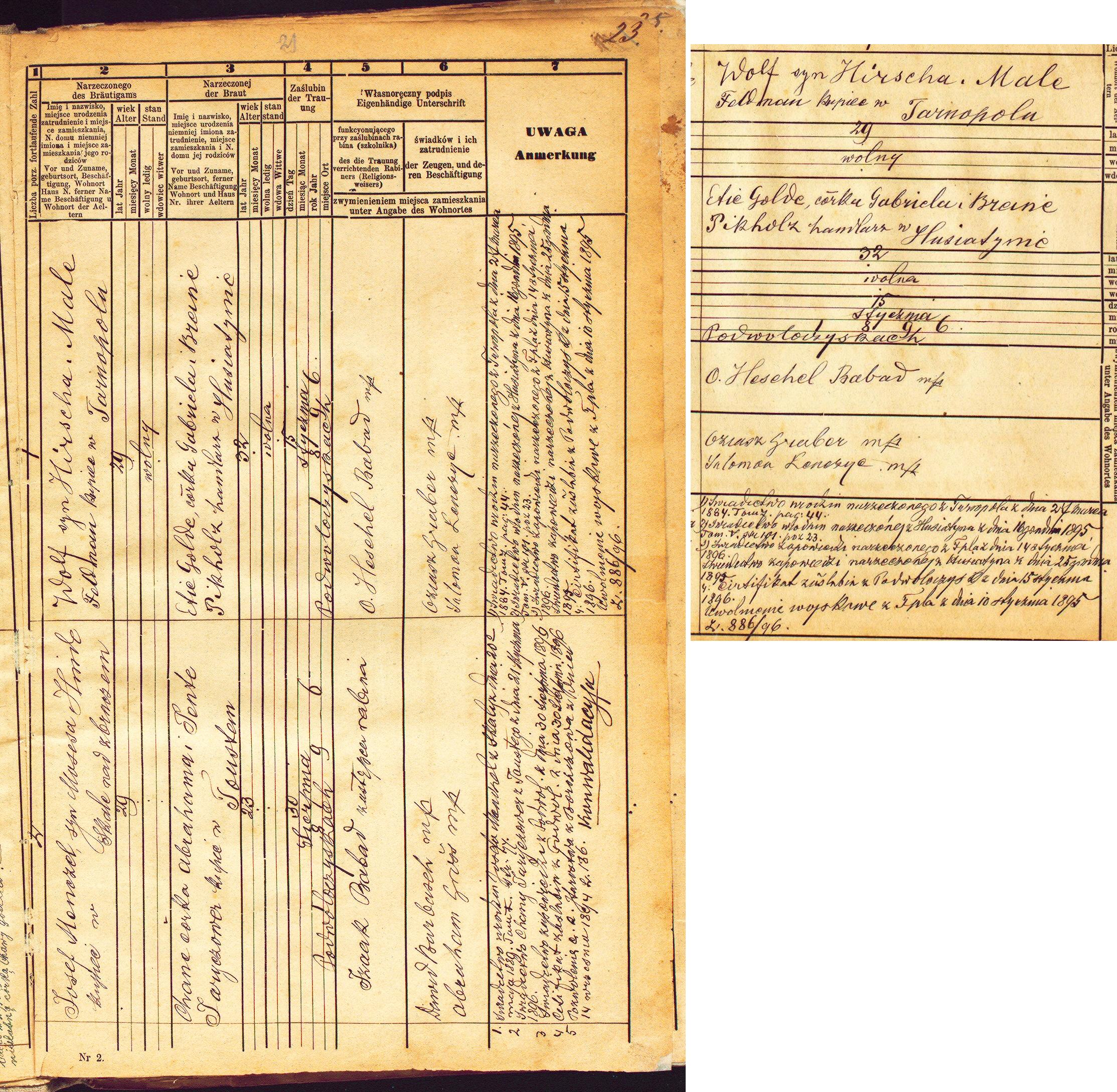 5 | 4 May 1892 | Bereszow Wielkie | Gittel | Josef | Sussel Gruberg | Dawid Eisik & Chaje | long unclear note | ROSA | |||