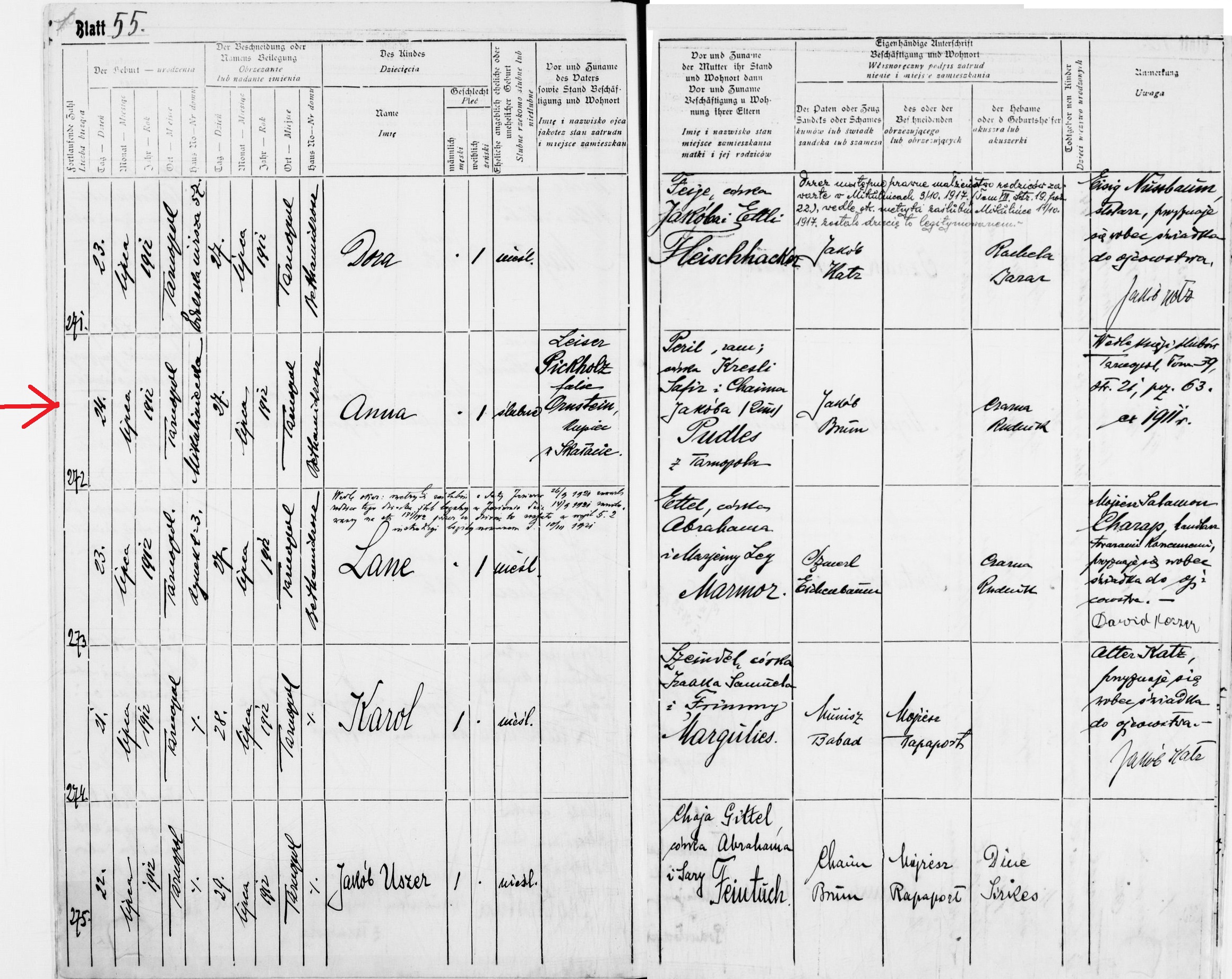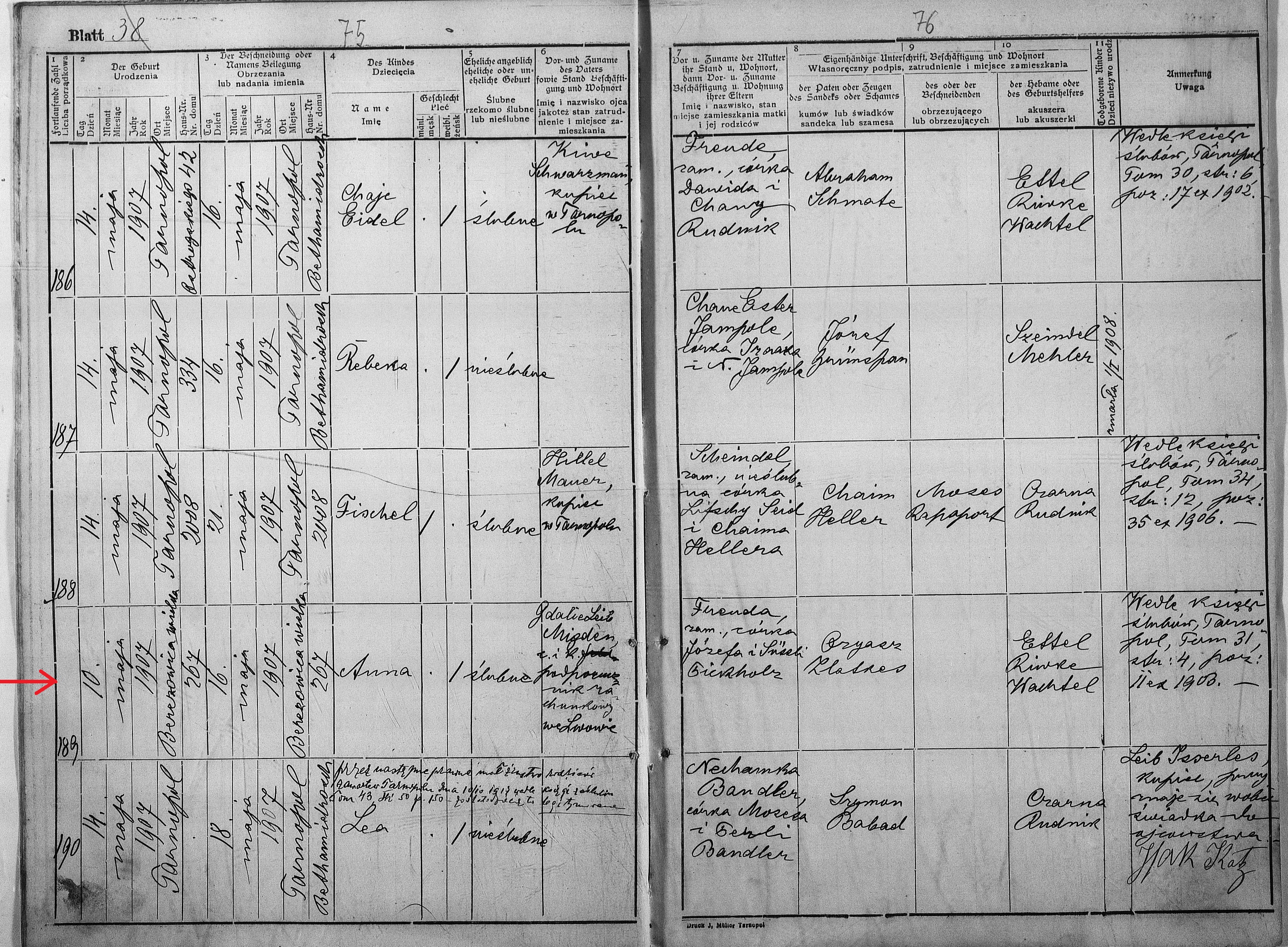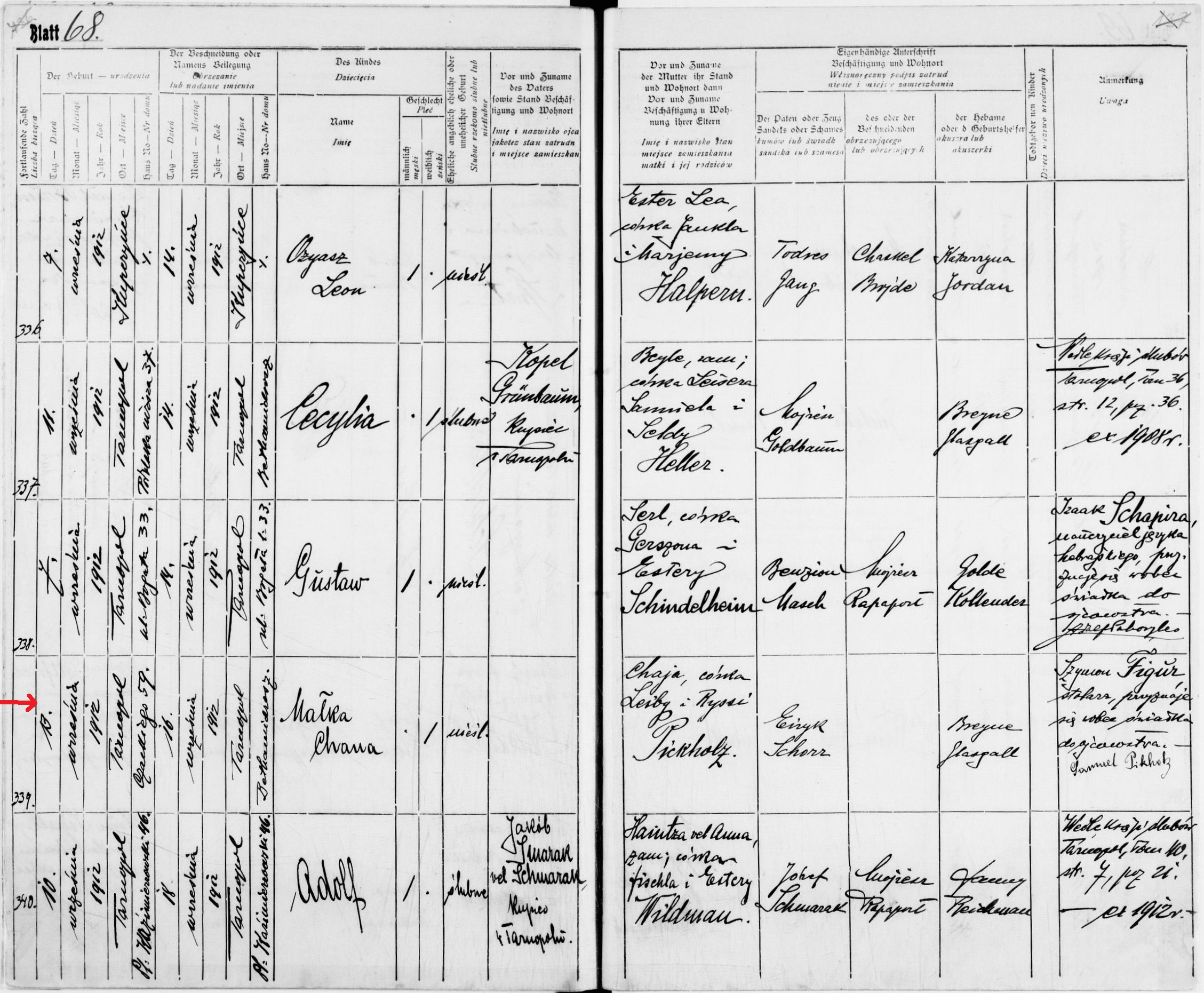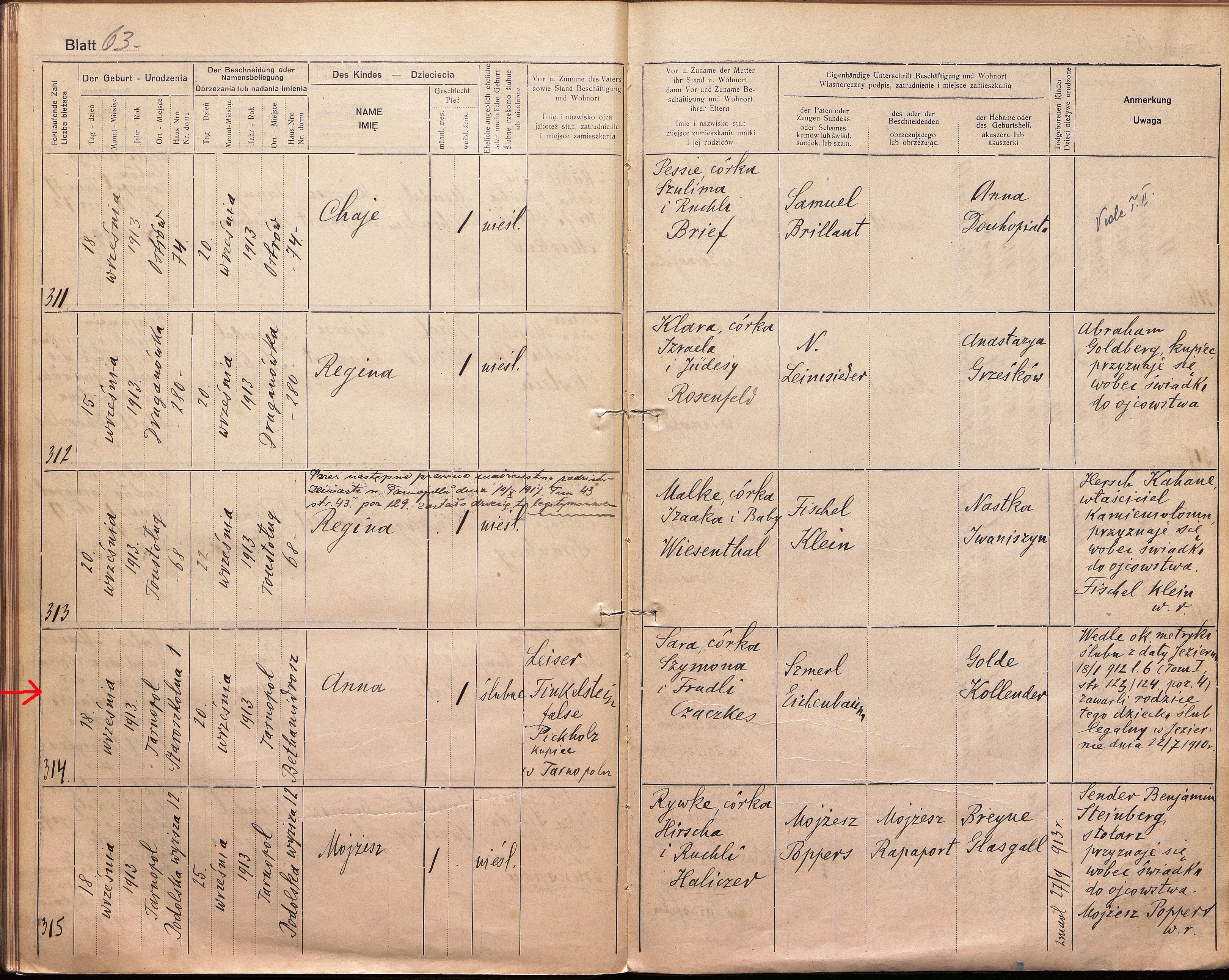 18 Sep 1913 | Starozkolna 1 | Anna Finkelstein | Leiser | Tarnopol | Sara Czaczkes | Szymon & Fradel | ELIEZER | ||||