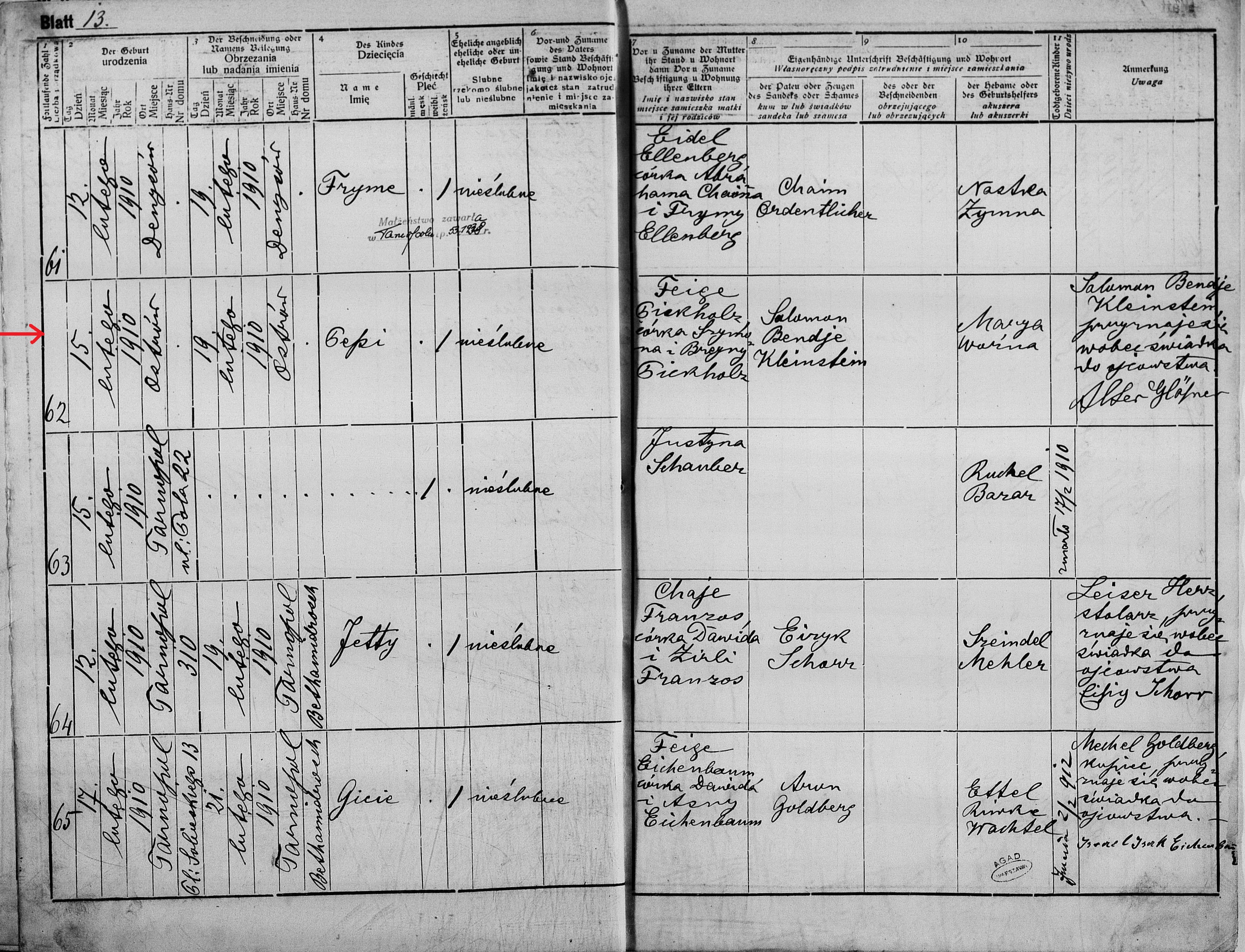 15 Feb 1910 | Ostrow? | Pepi Kleinstein | Salomon Brandje | Feige Pickholz | Szymon & Breyne | LAOR | |||||