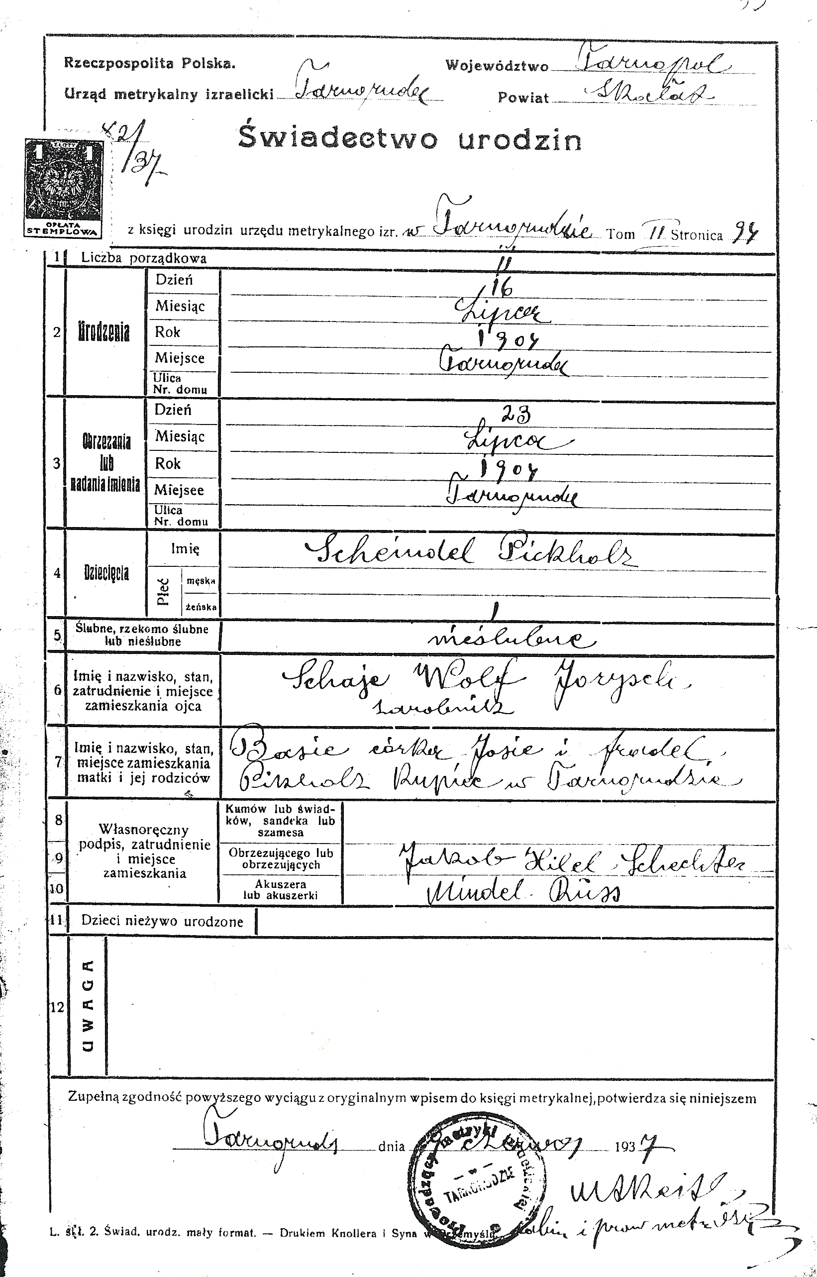 Breyne Pickholz | 30 Oct 1906 | Feige Pickholz | Tarnopol | ||||
