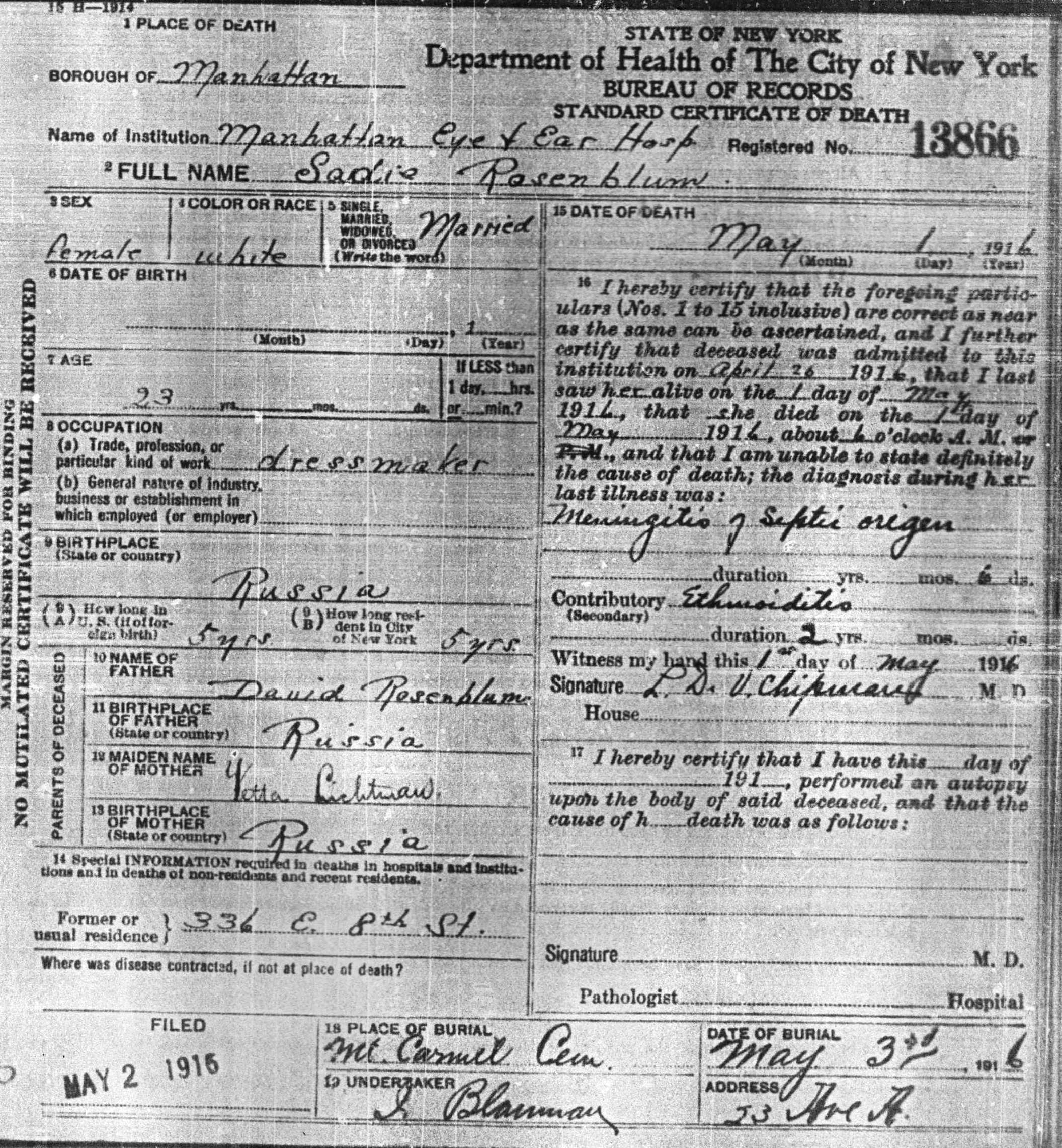 | Sadie died on 1 May 1916 and is buried in Mt Carmel Cemetery, NY.