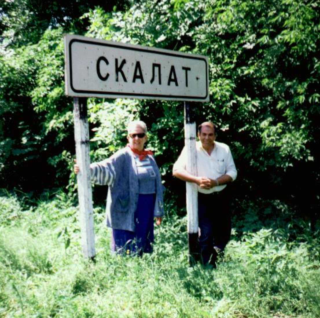 Third cousins at he entrance to Skalat - Betty Lee Hahn and Israel Pickholtz.